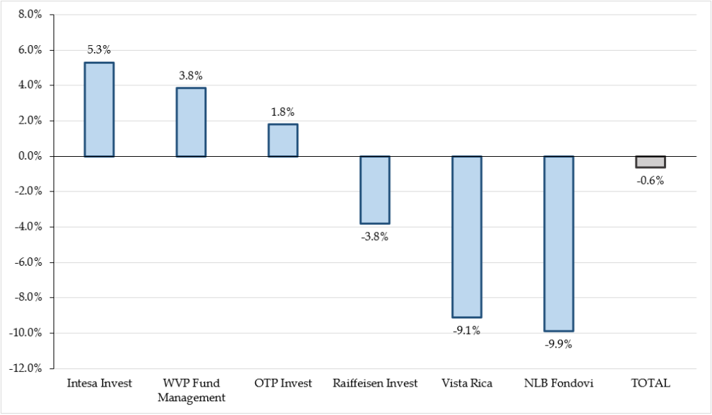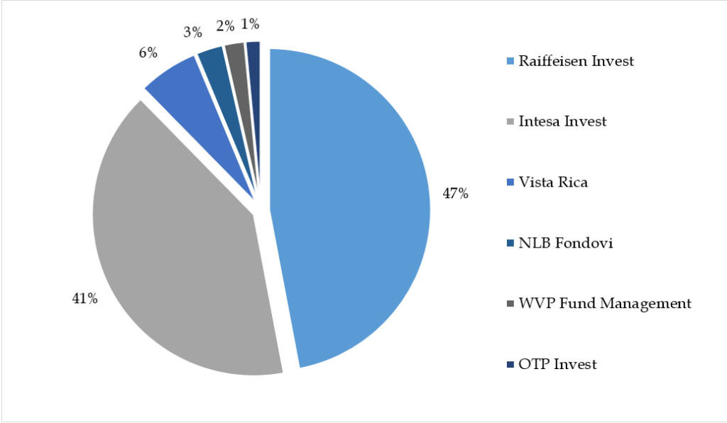 Pa da krenemo polako od šire slike – domaći investicioni fondovi su na kraju prvog kvartala imali za 0.6% manju neto imovinu nego na kraju prošle godine, a zanimljivo je da su NLB Fondovi i Vista Rica zabeležili poprilično značajan pad neto imovine od 9.9% i 9.1%, respektivno. Sa druge strane, Intesa Invest je zabeležo rast neto imovine od 5.3%, što je indikacija da se nakon prvog kvartala povećala koncentracija kapitala u dva najveća društva za upravljanje fondovima, sa obzirom da sada Raiffeisen Invest i Intesa Invest sada kontrolišu oko 87.7% ukupne imovine investirane na domaćem tržištu otvorenih fondova.